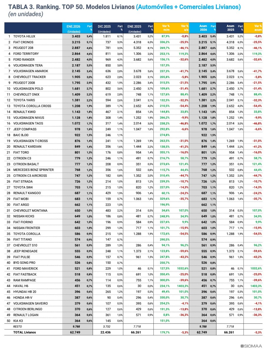 El "top ten" de marcas se completó con Chevrolet, que alcanzó 5.104 patentamientos, Renault, con 4.618, Citroën, con 2.733, Jeep, con 1.662, y Nissan, con 1.597 unidades. En cuanto a los modelos, la Toyota Hilux volvió a posicionarse como el vehículo más patentado del país, con 3.403 unidades registradas en enero. En segundo lugar se ubicó el Fiat Cronos, con 3.215 vehículos, seguido por el Peugeot 208, con 2.887.